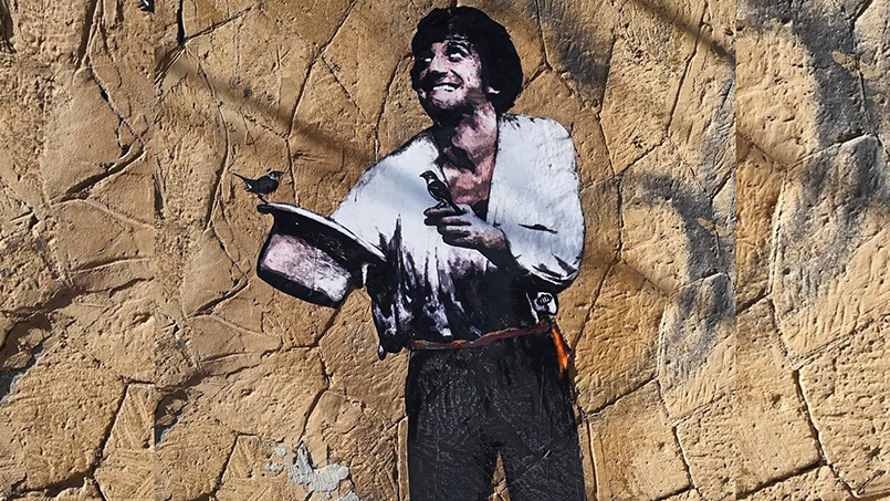 In Via Capraia, poi, già protetto da un pannello di plexiglass anti-vandalismo/furto, è un delicato ritratto in carta dell’artista Harry Greb, dove stavolta l’omaggio è al Proietti di “A me gli occhi, please”, lo spettacolo teatrale che lo consacrò definitivamente.