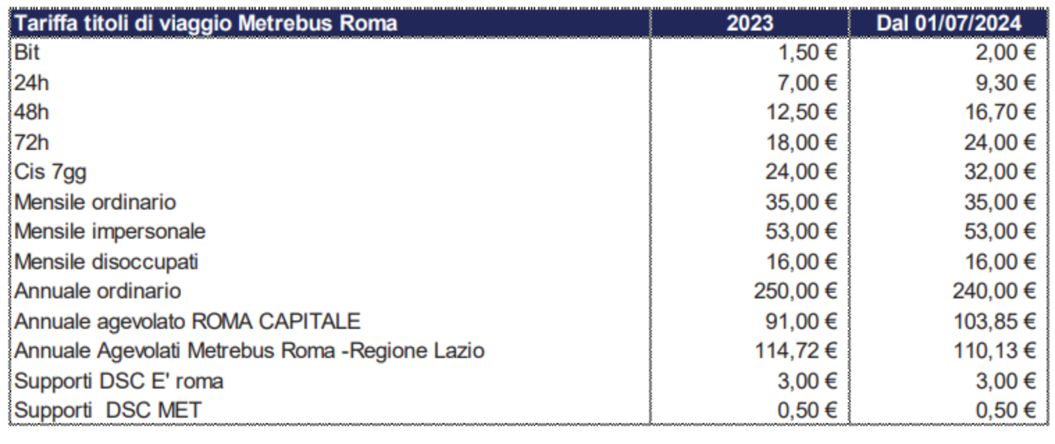 Perché un aumento proprio adesso, dunque? Inflazione e diminuzione dei finanziamenti da parte del governo, principalmente: così la decisione è stata presa, e dal 1 luglio lo storico BIT (il biglietto di corsa semplice) attualmente in vendita a 1.50 euro passerà a 2 euro. Anche le altre aziende che partecipano al consorzio Metrebus (quello che consente di viaggiare a Roma e nel Lazio con un solo biglietto) si adegueranno: Cotral (bus extraurbani) ha confermato, non ancora Trenitalia, che dentro i confini di Roma attualmente permette di viaggiare sui soli convogli regionali al prezzo speciale di 1 euro.